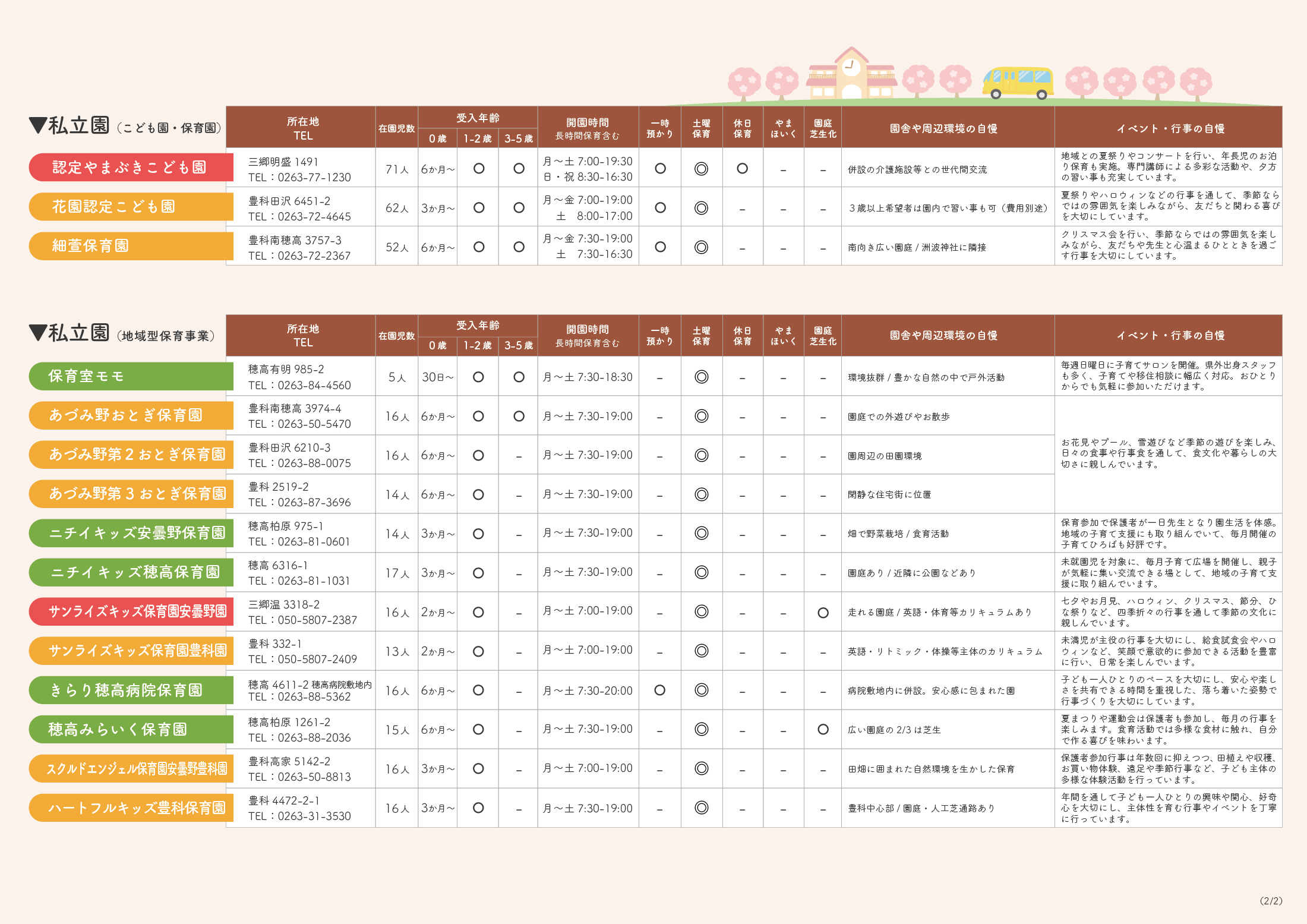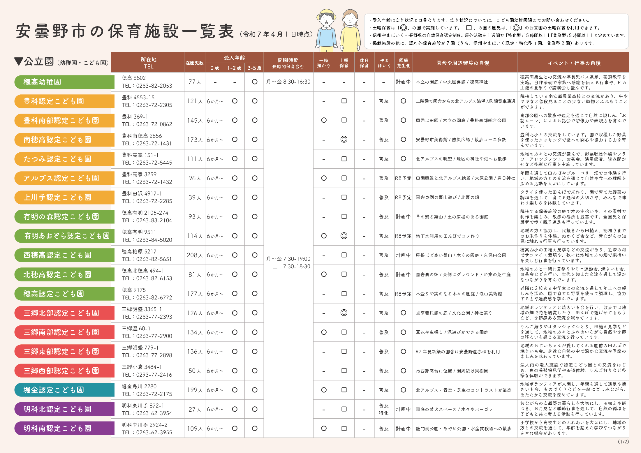 安曇野市には、公立・私立を合わせて約40の認定こども園・保育園・幼稚園があり、このうち公立園は19園(認定こども園18園、幼稚園が1園)あり、全ての認定こども園で長野県が推進する「信州やまほいく(信州型自然保育認定制度)の認定を受け活動しています。
