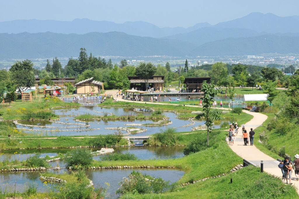 安曇野の大自然と郷土の歴史や文化に触れることのできる国営公園では、アスレチックや遊具があり、めいっぱい体を動かすことができます。また四季折々の花や自然観察も楽しめるほか、イワナやヤマメなど、安曇野にすむ清流の魚たちをの水槽展示や自然素材を使ったクラフト体験もできます。一年を通じて様々なイベントが開催され、休日は家族連れで賑わいます。