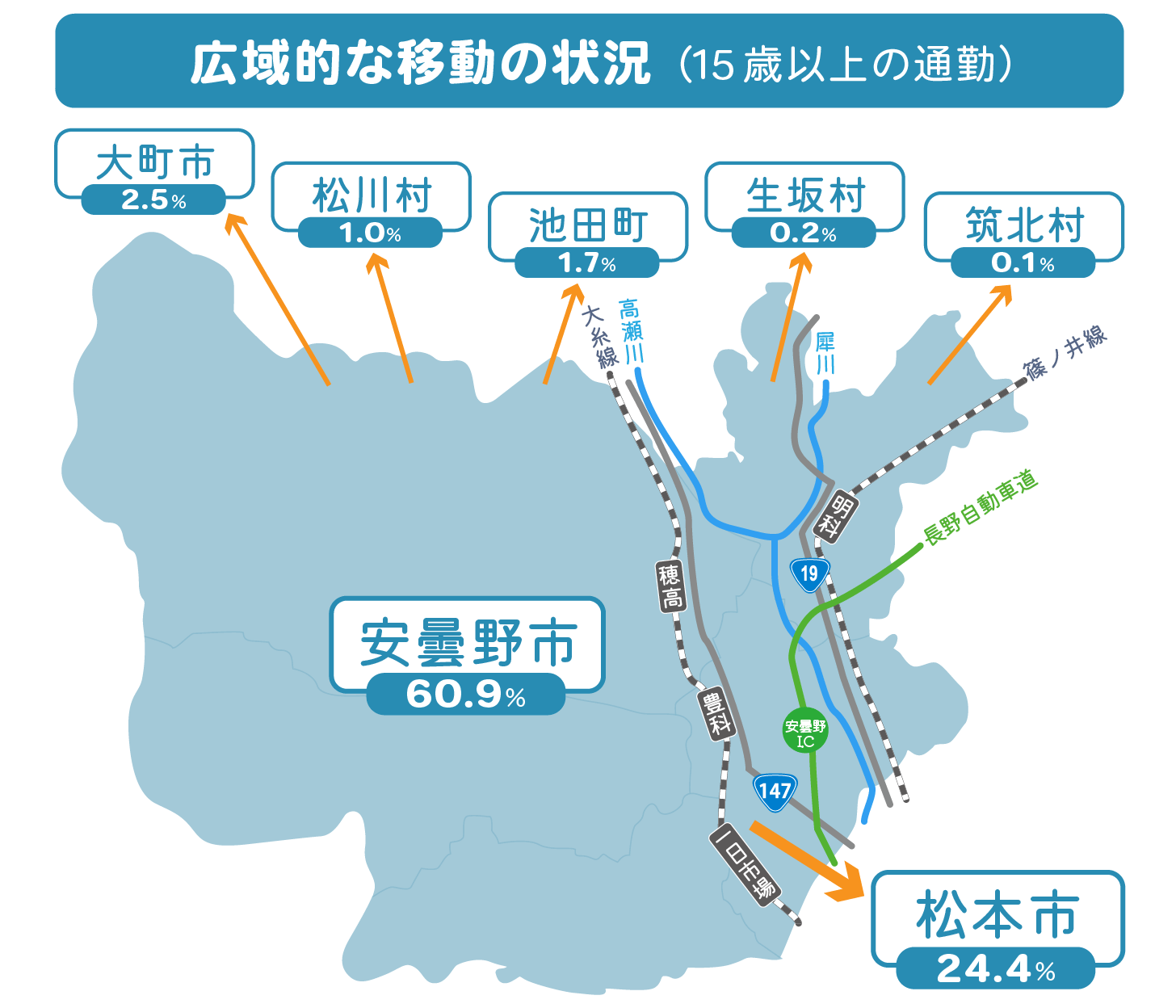 働く市民の約60%は市内で勤務をし、約25%は長野県第2の都市であり事業所の多い松本市へ通勤をしています。仕事探しの際は、安曇野市に限らず、近隣市町村も含めた幅広い地域で探すとよいでしょう。