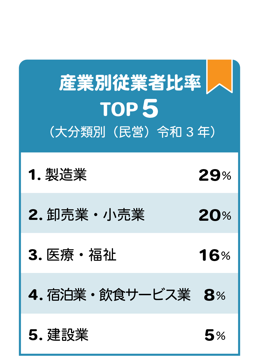 安曇野市は、農業をはじめとする第一次産業に加え、製造業・卸売業・小売業、医療・福祉、宿泊業・飲食サービス業、建設業など業種の幅が広い地域です。